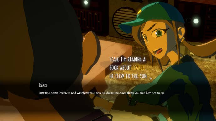 I unfortunately stumbled a bit with this system. Over the course of conversations in the episodic sections, a word or phrase is occasionally highlighted in yellow. Click on it, and there's a short glossary-like explanation, usually offering further context about whatever was said. These words show up at the end of each episode, floating around in a sort of word cloud. Then, it has you pick just seven of them.