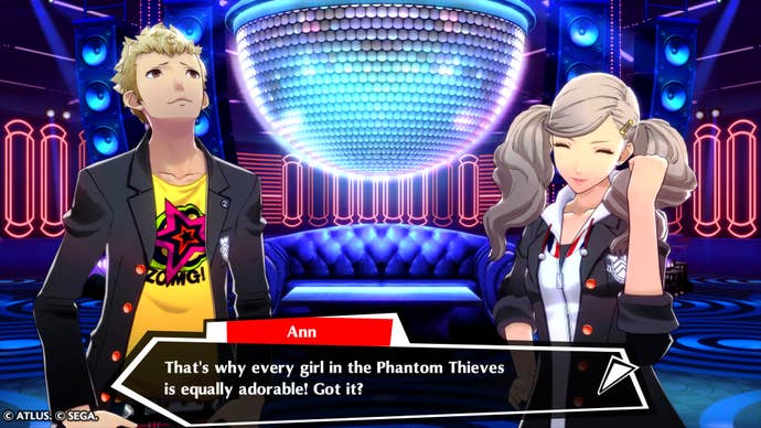 The Social event scenes, which contain a handful of dialogue options and either one or two characters facing you, usually revolve around the loose set-up as to why you're all there: you're in a dream, preparing for a ball in the series-constant Velvet Room. Because of this, when you meet up with your pals, you're practicing dancing and talking about dancing at some capacity. With this being a non-canon spin-off, allegedly when everyone wakes up, no one will remember anything.